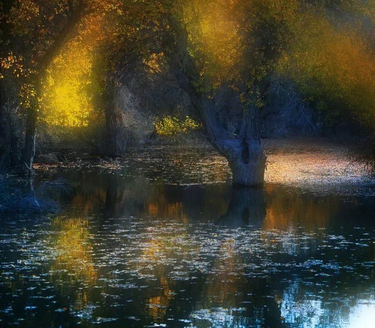 每年的这个时候,位于祖国西北边疆沙漠腹地的这片胡杨林,如同招蜂引蝶的花丛,吸引着我们这群辛勤的“蜜蜂”闻香而来。你简直难以想象在这浩如烟海,孤寂荒凉的沙漠中,会有如此“别有洞天”的一汪碧水,一片被金色与红色渲染的世外仙源。