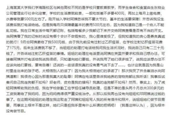 信中,向海清哭诉,孙俪每个月只给自己500元生活费,一旦要钱就会被骂。