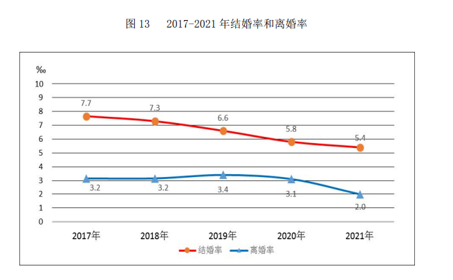 2017-2021年结婚率和离婚率 / 《2021年民政事业发展统计公报》