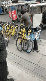 一名满身油污的流浪汉,默默扶起了一辆又一辆倒地的共享单车。