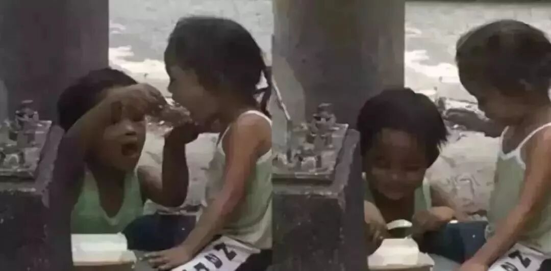 一个乞讨的小男孩要到了一份简餐,迫不及待地喂给妹妹吃。