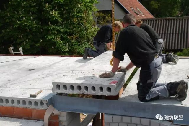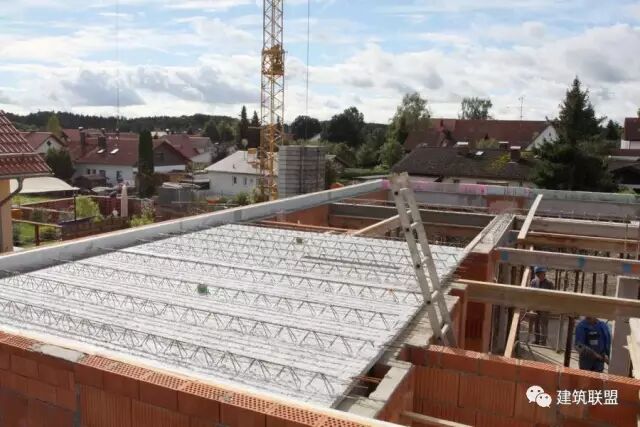 使用露出一半钢筋笼的预制钢筋混凝土大型薄板,作为承重楼层结构,浇注上部混凝土的底面模板,