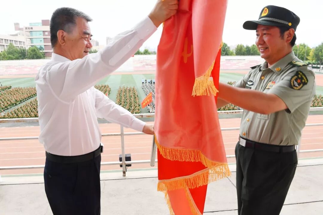 宋觉为军训旅授旗,杨宗科在开学典礼上致辞。