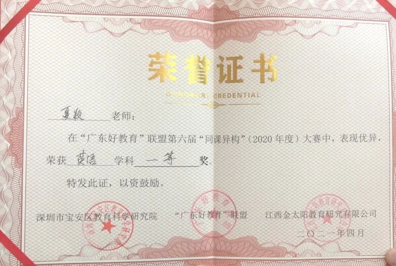 2021年4月14日至15日,为期两天的“广东好教育”联盟第六届“同课异构”大赛总决赛成功在深圳市宝安区富源学校落下帷幕。我校高中英语科组夏颖老师参加本次大赛,经过两天的激烈角逐,最终荣获一等奖。