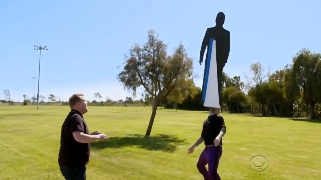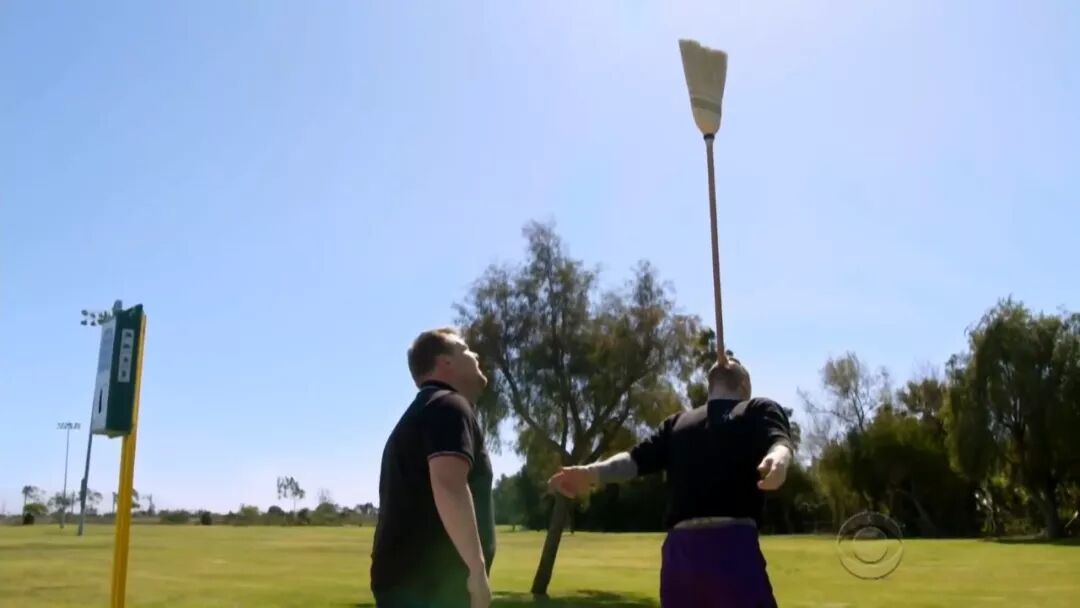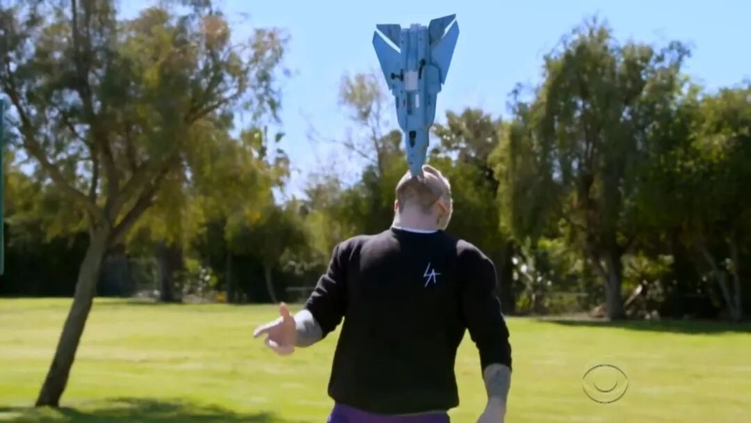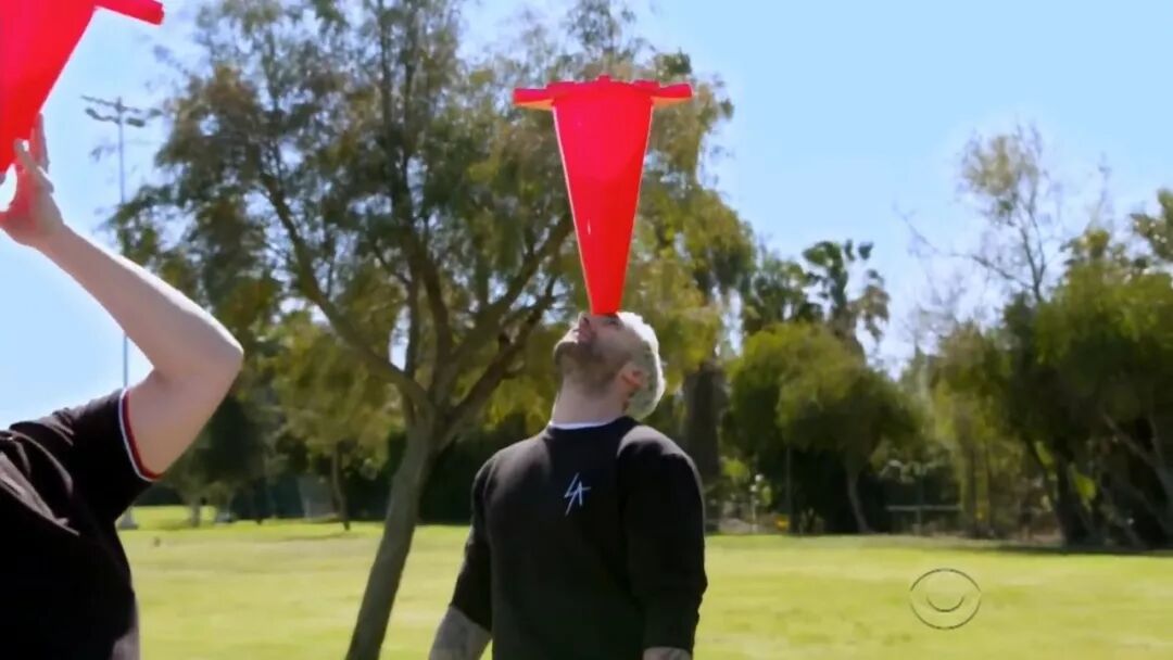 接着Adam向James展示自己可以用脸撑起所有物品的能力,两人逗趣地在路边展开一场平衡大赛,骚当的脸能顶任何东西。