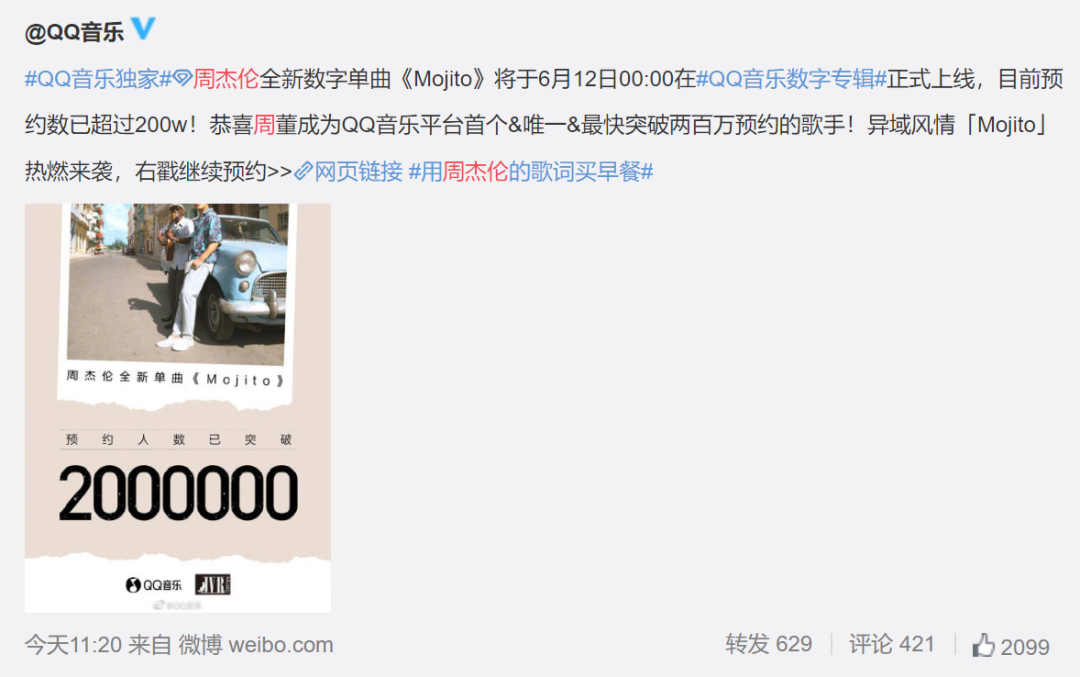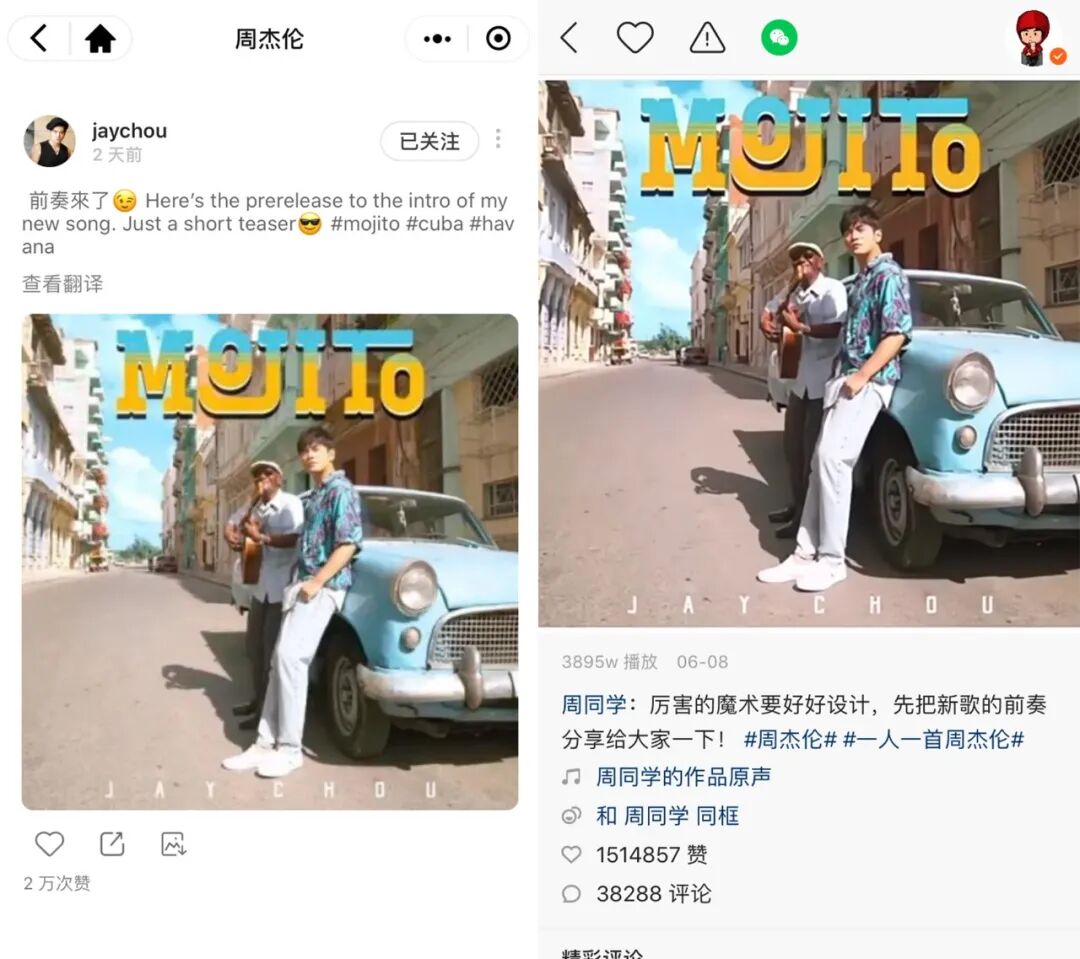 周杰伦发布新歌《Mojito》!歌迷:中年人们等的好累... 青春上海 港台男星 2020-06-12 09:22:08 994 创作不易,用心坚持,欢迎请BaGua喝几杯爱心咖啡!打赏并支持本文 打赏并删除本文 是什么让一群中年人午夜刷屏?是周杰伦啊!今天零点,他的最新单曲《Mojito》正式上线!周董的“夕阳红”歌迷们你的朋友圈被刷屏了吗?↓先放上MV↓ 世界上最漫长的等待,莫过于等周杰伦发新歌......距离周董的上一首歌《说好不哭》发布已经过去9个月时间。歌迷们当然是练出了炉火纯青的催歌本领花式催新歌周杰伦的粉丝绝对是专业的!比如……用周杰伦的歌词买早餐一开口就知道是老杰迷了老板表示鸡蛋易冷给你一首歌的时间吃 这是你和我的约定请你一路向北离开我的摊位!小编闻着七里香喝着爷爷泡的茶看着最长的电影终于等到了新歌《Mojito》的出现 和9个月前发《说好不哭》一样,这一次周杰伦依然提前在 IG上突然放了预告。一边晒车一边说:下礼拜有新歌听了。随后又公布了新歌歌名及16秒前奏。一经发布,瞬间就登上热搜。夕阳红粉丝团的粉丝们,大概是想起了去年新歌上线时被QQ音乐卡到闪退的恐惧。纷纷跑去提前预约了新曲数字专辑。这不,不费吹灰之力就让周董成了QQ音乐首个也是唯一最快突破两百万预约的歌手。有人说只有周杰伦才能打破周杰伦的记录。还有人说周杰伦发新歌就像过年,所以称之为过周年。QQ音乐买歌叫买年货,发朋友圈叫周年庆。“麻烦给我的爱人来一杯 Mojito,我喜欢阅读她微醺时的眼眸。而我的咖啡糖不用太多,这世界已经因为她甜得过头。”这次的歌名「MOJITO」,中文被称为「莫吉托」。度假花衬衫、复古老爷车、马拉贡海滨大道、古巴风情街景...周董带你夏日古巴一日游。拍《告白气球》去了法国,这回飞到了古巴。MV 里,41 岁的周杰伦,还跳起了古巴当地特色的萨尔萨(Salsa)舞步。没什么,咱年轻的时候,还玩过武打呢。据说拍摄 MV 期间,当地的古巴乐手还盛赞周杰伦的新歌很有古巴音乐的风格。这一次的《Mojito》,无论从旋律还是歌词来听,都像是回到了我们熟悉的周董的味道。听完新歌之后,众多歌迷朋友纷纷留言:重点来了!周董透露:《Mojito》之后暂时不会有单曲的推出,再来就是新专辑了这一次你有被新歌甜到吗?综合自黄浦新青年(ID:huangpuyouth)、齐鲁晚报(ID:qiluwanbao002)、场库、周杰伦国际后援会责任编辑:唐昱霄点个“在看”分享给更多人 创作不易,用心坚持,欢迎请BaGua喝几杯爱心咖啡!打赏并支持本文 打赏并删除本文 感谢您的支持鼓励,我会继续努力的!文章地址:用户邮箱:打赏金额:USDT 请输入数字点击”去打赏“,即可进行打赏支持本文章哦 周杰伦 About the Author 青春上海 功能介绍:中国共产主义青年团上海市委员会官方微信 Related Posts 周杰伦发布新歌《Mojito》!歌迷:中年人们等的好累... 2020-06-12 09:22:08 张学友书房开嗓、陈奕迅琴房弹唱、郎朗夫妻四手联弹!被这场演唱会暖哭了 2020-04-19 16:32:46 飞机上一张照片曝光,梅婷被骂上热搜榜首!本人凌晨3点道歉 2020-01-07 13:07:56 刚刚,王源道歉了 2019-05-21 16:07:46 发表评论