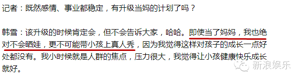 就连将来当了妈也不会晒娃,目测以后的亲子节目是看不到韩雪了。(在想韩雪会让自己的娃看《贝尔》嘛哈哈哈)