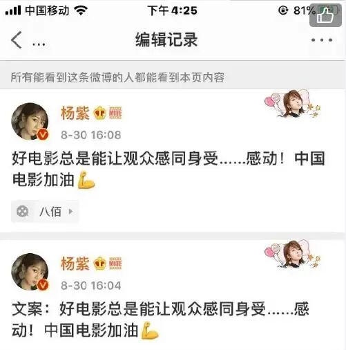 今天,杨紫转发动态给某电影宣传时,不知是手抖还是没看清楚,她一不小心把“文案”二字也加上了,直接尴尬翻车。虽然5分钟后她被粉丝提醒就迅速改正了,但编辑记录里面还可以查看到她之前的失误操作,编辑的速度够快,也还是被翻车追上了哈哈~ 事实证明,很多明星发这种宣传性质的动态,都是走走过场的场面活儿,真情实意帮忙打call的还是比较少,像杨紫这种案列,此前圈内发生频率也不小,比如前段时间欧阳娜娜生日,圈内明星的大型团建就造成过文案撞车的尴尬情况,张含韵跟和VAVA的祝福不仅文字一模一样,就连表情都没变……更搞笑的是,邓超都没搞明白欧阳娜娜发的是中文歌还是英文歌~看来看去,结果也就王源极为简短的祝福,显得真诚一点。 当然,因为文案翻车引发的热议,换另一个角度来看的话,也给明星宣传的效果达到了最大化,所以今天杨紫引起关注之后,瓜众都说这个技能可以写进营销策划经典案例,也不愧她宣传小能手的称号了!