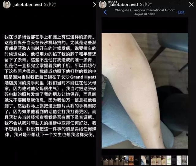 就在当天JULIETA再一次发表长文,这一次她晒出了自己手臂淤青的图片,表示这都是蒋劲夫家暴她留下的证据。