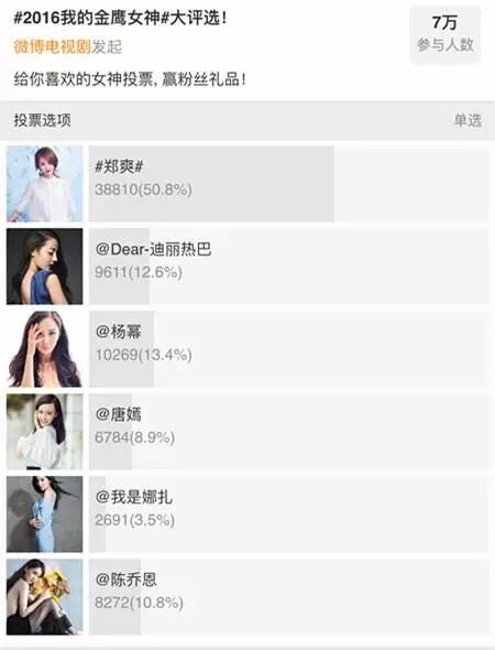 最近备受关注的金鹰女神票选,郑爽在各个平台上的排名都呈现了压倒性胜利: