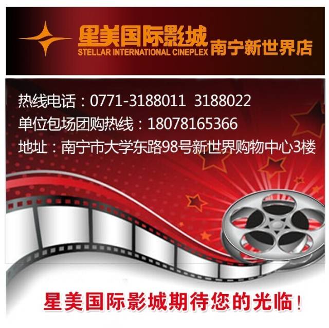 功能介绍:【星美国际影城南宁新世界店】位于南宁百货新世界购物中心A区三楼(广西大学正门旁),占地面积3700平米,拥有3个标准厅和1个巨幕厅,共有800多个座位.真实、震撼的音响,带给您身临其境的奇妙体验!星美国际影...