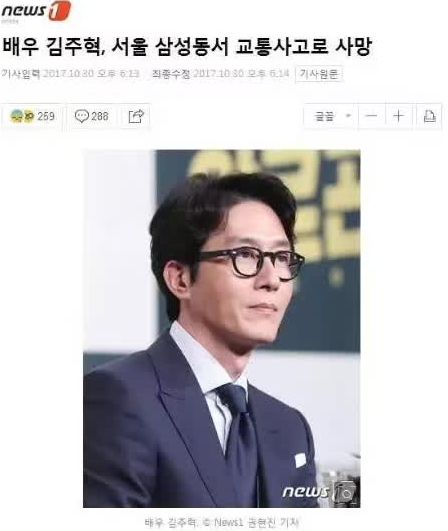 2017年10月30日,韩国演员金柱赫当天下午16点30分左右因交通事故去世的消息震惊中韩网友。