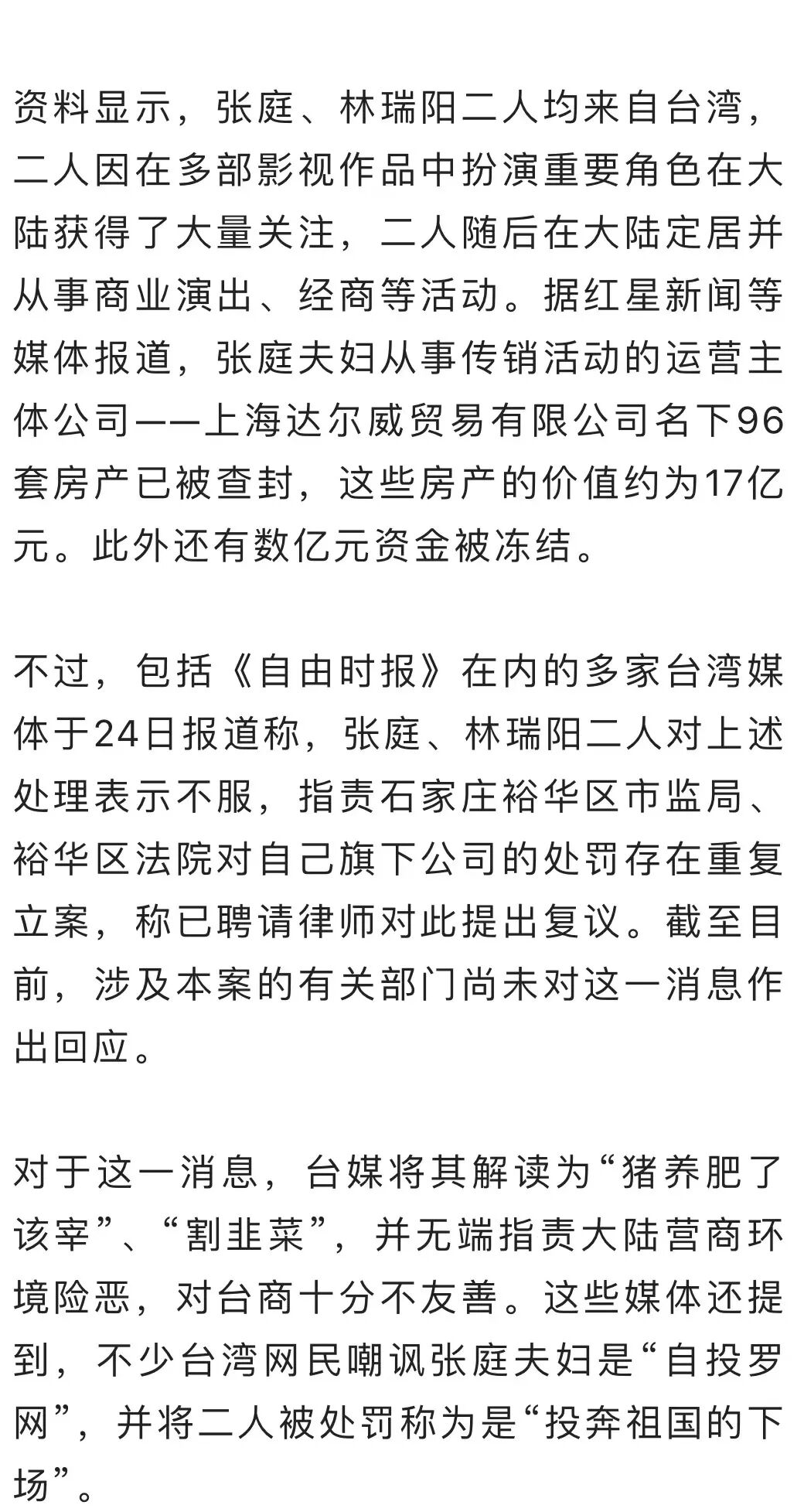 此前,张庭、林瑞阳夫妇因从事传销活动被大陆有关部门调查处罚,二人及旗下公司共计20亿元资产被查封。但在24日,多家台媒密集报道了二人于近日提起复议,这些报道指控有关部门对二人的处罚措施是“针对台商”、“割韭菜”。