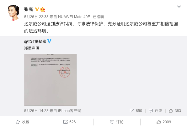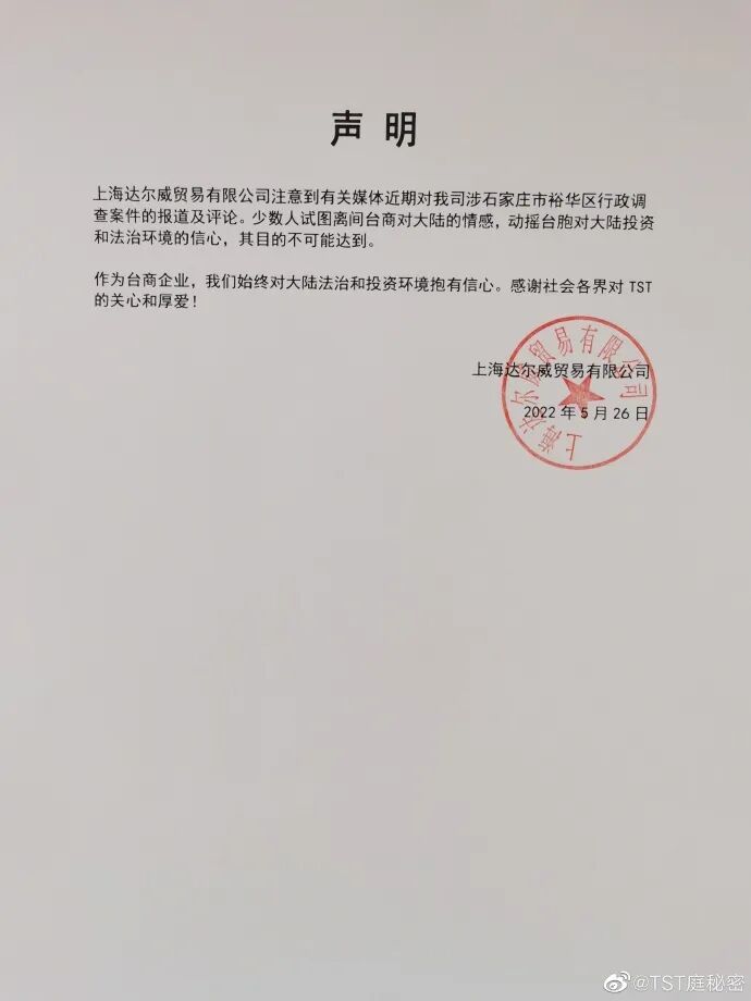 张庭转发了“TST庭秘密”的声明,声明中就个别台媒恶意炒作张庭、林瑞阳起诉石家庄市监局传闻回应,表示他们注意到公司涉及行政调查案件的报道,称这是少数人试图离间两岸关系,动摇台商的信心,其目的不可能达到:“作为台商企业,我们始终对大陆法治和投资环境抱有信心,感谢社会各界对TST的关心和厚爱!”