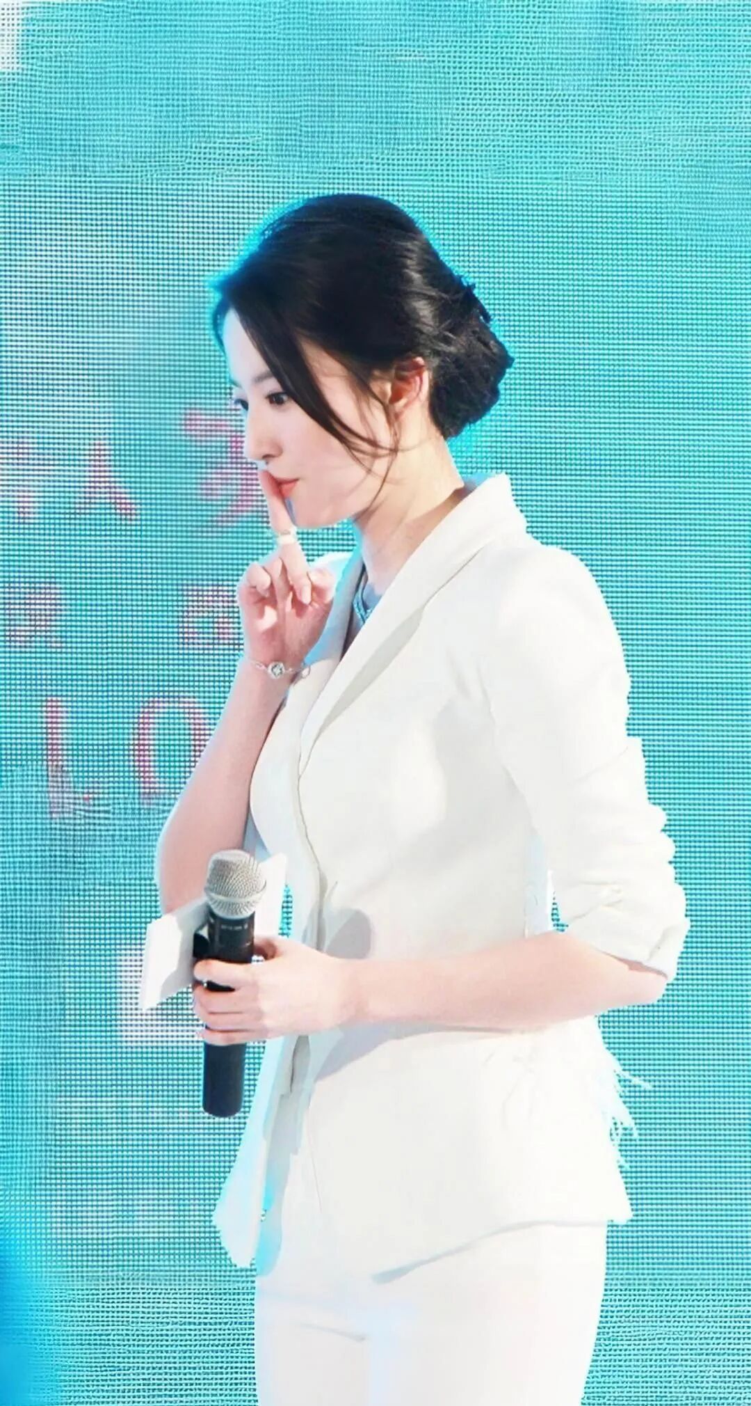 刘亦菲站起来的那一刻,左手拿着话筒,头微微一低,右手食指放在嘴唇中间,像是示意大家安静的动作,这个动作的刘亦菲也太让人着迷了!