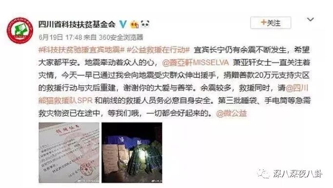 最后真的要赞一下萧姐,对于新恋情她没有任何的回应,反而是悄咪咪给地震的四川宜宾捐了20万。她没有任何的宣传,也没有任何的通稿,要不是这个微博发出来,还真的是没人知道啊。