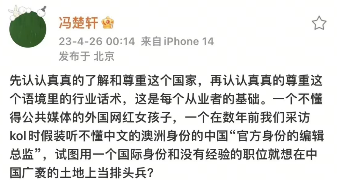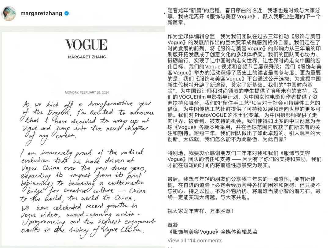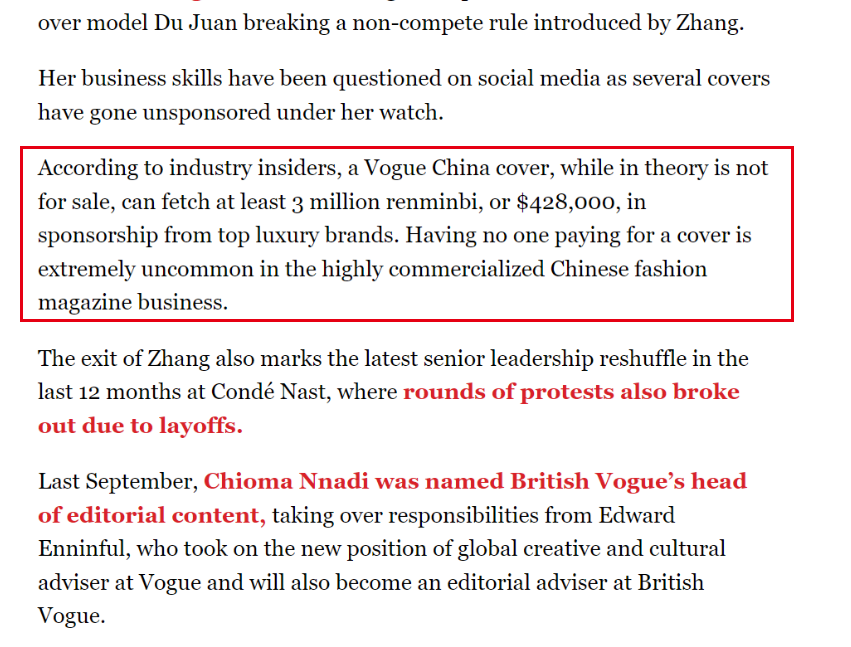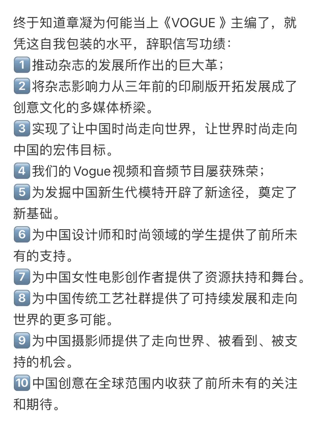 郭敬明即将接班Vogue?前主编水简历被揭穿跑路... 一姐撸铁日记 内地男星 2024-03-05 23:17:45 314 创作不易,用心坚持,欢迎请BaGua喝几杯爱心咖啡!打赏并支持本文 打赏并删除本文 今天的三条来自隔壁羊,姐妹们别忘了关注她~今日份感慨:时尚圈也是个巨大的草台班子。还有人不知道《Vogue》史上最年轻、最drama的主编——章凝,官宣离职了吗?手写的辞职信+成绩盘点(有亮点,待会说)看热闹不嫌事大的网友:郭敬明是不是要接班了?说回正题,从入职到跑路,不过短短3年,常年顶着一头蓝发的章凝创造了蛮多笑料。一张照片带姐妹们回忆一下长相?比如一言难尽的封面质量…比如去年那场「时尚之力盛会」。当她和小黄鸭、《Vogue》全球主编安娜·温图尔站在一块破窗帘前,不知道的还以为这是预算3000的年会?最搞笑的是,窗帘厂家后面还认领了相比张宇在位时的风光,章凝这几年一直被说“空有虚名却拉不来赞助”、“太不专业”。甚至这次离职,也疯传她是被安娜·温图尔换掉了。但事实真是如此吗?羊看完章凝的履历以及跳槽后的新东家,其实很想感慨姐或许是很多社畜的职场榜样。时尚圈女版大冰:自我包装大师,但实干一塌糊涂?首先,咱们来拆解一下章凝辞职信中的表述?从“推动杂志发展、让中国时尚走向世界”,再到“为中国摄影师提供了走向世界、被看到、被支持的机会”。描述得很高大上哈,但实际执行时却不是那么回事。开头羊说道,章凝自入职起到宣布离职,招来不少质疑和负面舆论。那么,在位期间她都干过什么?先说一个被很多圈内人吐槽的「排他协议」?简而言之,要求登上《Vogue》封面的明星,前3个月不能在其他杂志露脸。就连摄影师,前一个月也不能为其他刊物拍摄。去年五月刊本来定的是杜鹃,最后却被临时换下来,据说就是因为她在十几天前登过《T Magazine》四月刊。但时尚圈来来回回就这么些人,如果真将这种排他贯彻落实,并不现实…毕竟放眼全球,也没几个杂志有这规则?最后搞得《T magazine》主编下场阴阳。称章凝为:“一个不懂得公共媒体的外国网红女孩子、一个在数年前我们采访kol时假装听不懂中文的澳洲身份的中国‘官方身份的编辑总监’”。他后面删了这条微博但收不回已散发的火药味说到封面的选人标准,张宇在位时还蛮严格的。“除了ta的时尚感,还要在自己职业领域的成就非常高”。就这么说吧,自2005年创刊到2021年,登过《Vogue》中国版的内娱女艺人不超过15个(不含国模)。《VOGUE》中国版创刊号,2005年9月刊毕竟封面是时尚杂志商业价值的浓缩精华,因此怎么选人物、怎么拍都至关重要。从前的金九银十,不说张张好看,但审美都在线?反观章凝,她3年间共产出31张封面,其中16张都是国模。质量偶尔OK?多数时候像过山车一样不稳定。为什么?相比严选人物,她更喜欢支持新锐力量,减少跟大牌摄影师的合作。任期第一张九月刊便大胆启用新模特范靖涵和小众摄影师,前面说到杜鹃被临时换掉,也是找的范靖涵救场。即便有大咖坐镇,成品也总差点意思。比如巩皇与《Vogue》首次合作的银十,据说借了200多套高定,emmm最后却拍成了杀马特…还有变身拖把精的杨紫琼(dbq)。肯豆来也是神神叨叨的画风。后来为了补偿被鸽的杜鹃,章凝自己上手拍了一回,emmm结果被说像十元大头贴。对比意大利版的开年刊,其中的差距不言而喻。杜鹃:谢谢,姐没这么接地气过如果封面一直饱受诟病,即便不能代表主编能力欠缺,至少也代表了她不懂得如何把控整体风格。 为了挽回局面,章凝当然也努力过。她推出了中国新锐设计师大赛、还有播客,但受众群体过于小众,最终效果还是一般般。这几年下来,最大影响是广告收入锐减,流失了很多明星资源和奢侈品牌客户。比如张宇任职期间曾赞助大量活动的Chanel,在章凝上任后投放预算大幅减少。Chanel固定支持的VOGUE Film,以及《Vogue》与宝格丽合作了几年的 Avrora闪耀之辉盛典项目也戛然而止。之前一期封面至少有300万赞助,后面章凝几乎拉不到,甚至有3期直接挂0,开了天窗…还记得开头提到的时尚盛典吗?不止布景寒碜,赞助商从昔日Chanel变李维斯、彪马(没有说这俩品牌不好的意思),很多大花也直接不来,只邀请到了倪妮周冬雨。再忆往昔,张宇一出马,张曼玉周迅李冰冰杨紫琼章子怡邓文迪…那叫一个群星闪耀。Vogue120周年庆典anyway,圈内人都认定章凝属于德不配位,《Vogue》国内版的影响力也在逐渐减弱。那么,这是章凝一个人的锅吗?是水土不服还是行业在走下坡路?章凝为什么水土不服?这和她的生长环境分不开。章凝爸妈是从台州去澳大利亚的第一代华人,而她本人从小在澳大利亚长大。一路的成长轨迹基本是中产家庭ABC标配——从小练钢琴和芭蕾,高考名列前茅,然后以商学和法学双学位毕业于悉尼大学。业余生活也蛮精彩,title多到堪比大冰?16岁创建个人博客以及个人网站。22岁以网红身份入围亚洲地区福布斯30岁以下的精英榜。2015年成为某护肤品牌的全球代言人。2016年被全球时尚媒体BOF评选为“时尚行业年度500强人物”。此外还是第一个登上澳大利亚版《ELLE》的亚洲面孔,曾掌镜 Gucci、LV等大牌的时尚大片。27岁又解锁《Vogue》中国最年轻主编成就。但title虽多,她的审美品味却不够本土化,不能拿捏内地市场的喜好。拿中国风的主题来说,最终呈现出的效果be like?但不可否认,章凝身上有一