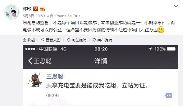 也因此,“王思聪与陈欧互怼”、“思聪立帖吃翔”的话题分分钟上了头条,主因“共享充电宝”有无前景也受到热议。