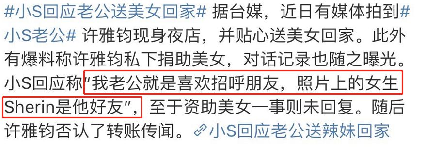 当时小s回应:“我老公就是喜欢招呼朋友,照片上的女生Sherin是他好友”。