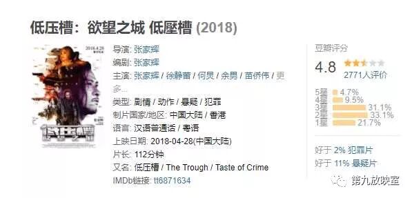 原本是想趁着五一节,加上外国大片没上映的档期,抢占票房市场的高地,谁料到《低压槽》碰到了爆款《后来的我们》还有强敌《幕后玩家》。当然,除了竞争对手炮火凶猛以外,自身电影被吐槽剧情很扯,莫名其妙也不在少数,目前豆瓣评分4.8分,张家辉想打造中国版的《罪恶之城》结果拍出个四不像,最后装13过头让观众看着浑身难受,包括小编在内看完都一脸懵逼。