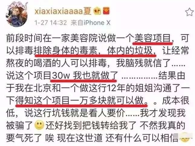 除了张某,网红夏某也去打卡了,前前后后花了三十万,结果一个同行妹子告诉她,这套疗法其实花一万块就能做。