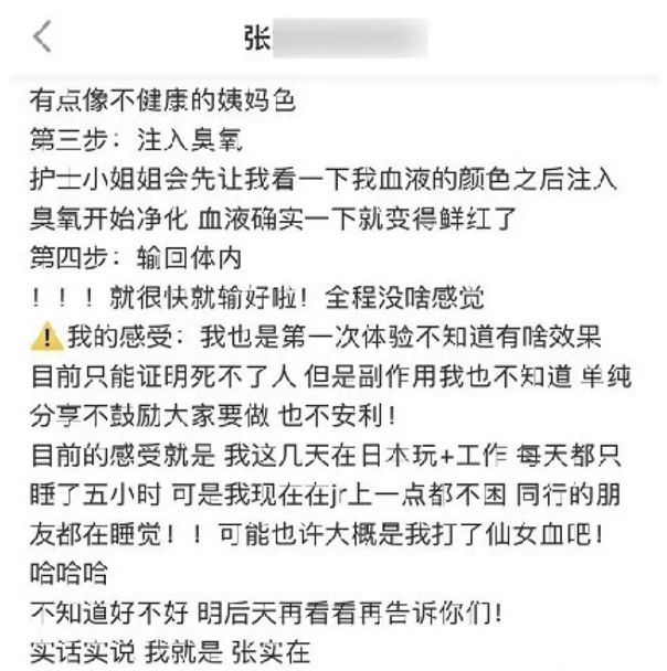 就在不久前,网红张某在网上分享了她在日本期间体验换血疗法的经历。