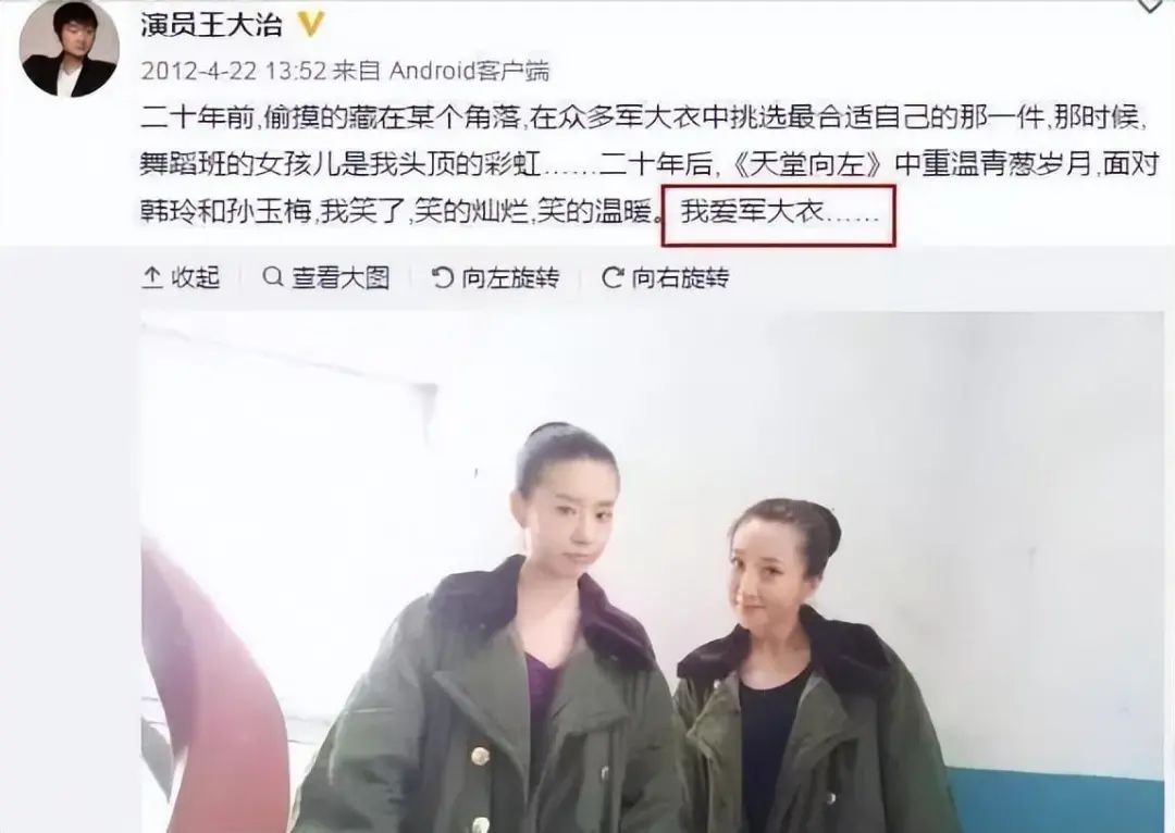 王大治高调发文:“我爱军大衣”,配图是穿着军大衣的董洁。