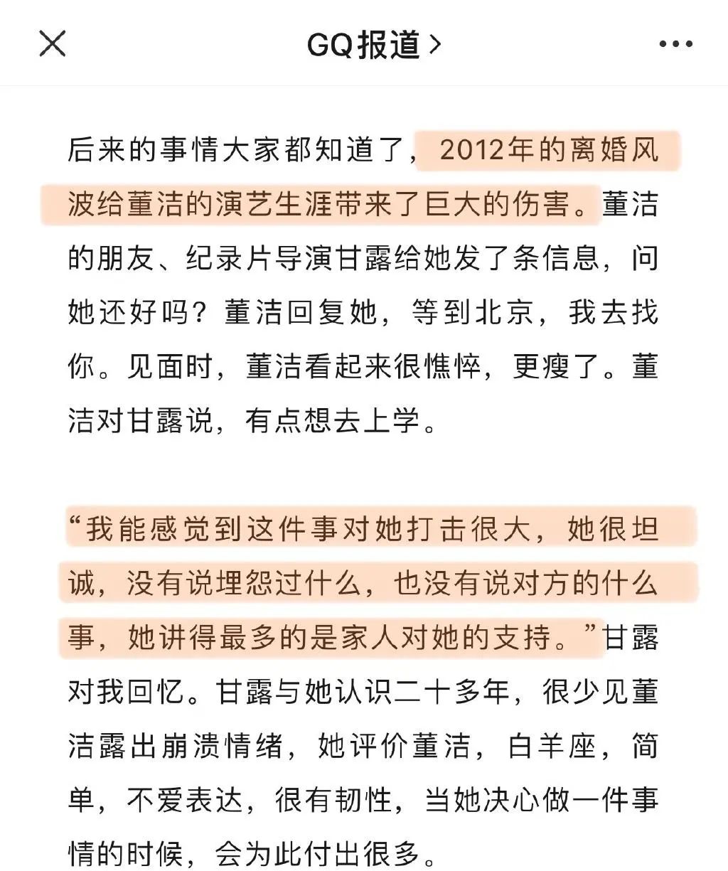 然而,仅仅过了四个月,董洁好友竟然公开发表言论称,12年的离婚风波给董洁的演艺生涯带来了巨大的伤害,董洁却从未埋怨过潘粤明。