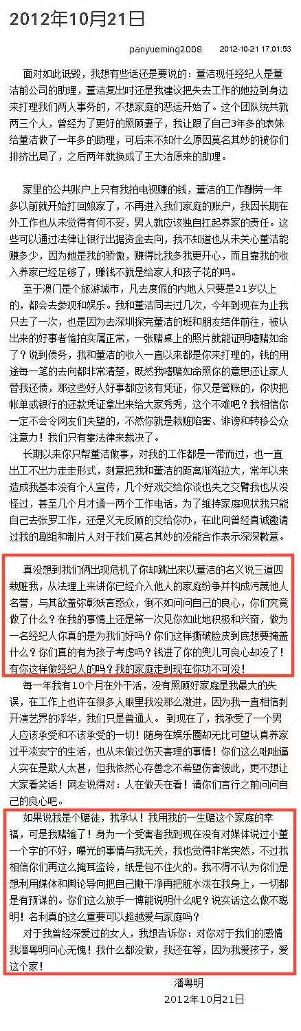 可潘粤明却不愿意说董洁半句坏话,只是以损害名誉权为由,把董洁的经纪人告上了法庭,并对她的指责进行逐条反驳。