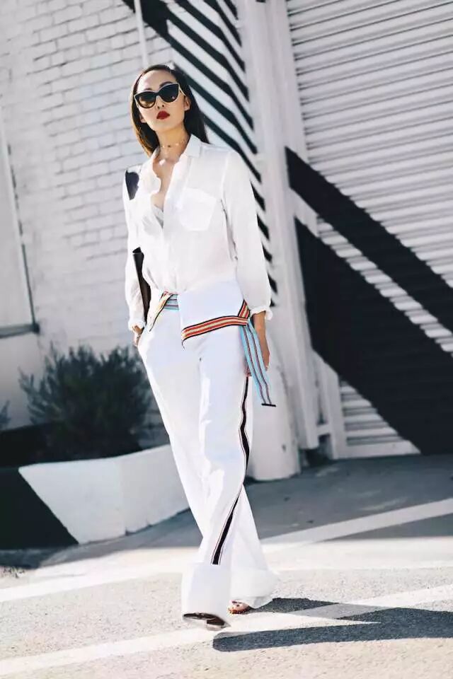 和之前Honey and Silk温柔的全白搭配不同,Chriselle的搭配更加干练,白衬衫搭设计感十足的白色西装裤,气场一下子就被提炼出来了。
