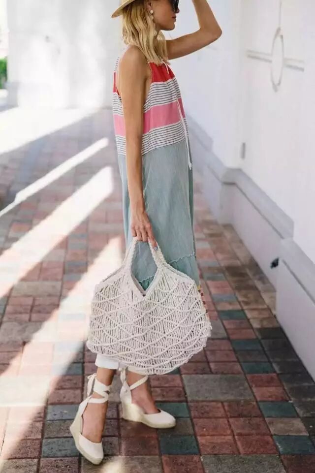 其他单品也同样都选简单随意的自然卦就好,比如草编鞋,比如编织袋,比如草帽。不过这种款式的连衣裙,最好还是身材高挑的纸片人,穿起来清新飘逸,个子矮或者身材丰满的姑娘,还请慎重选择,避免拖沓。