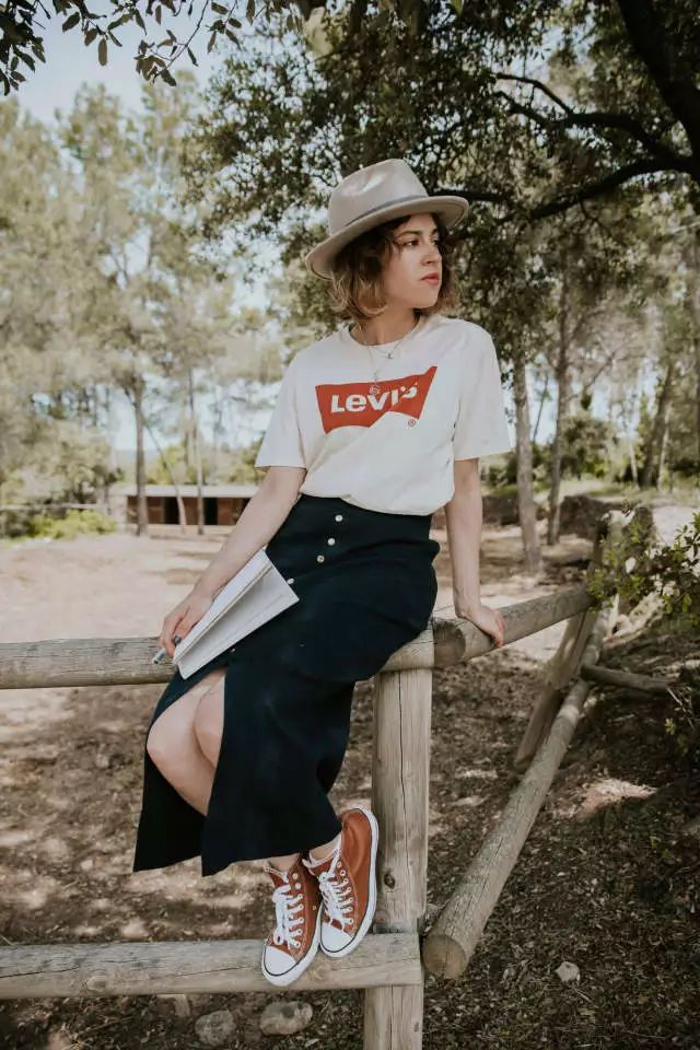 随意的Logo tee和帆布鞋,搭配复古的开衩半裙和小礼帽。俏皮随意带着一丝优雅。