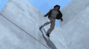 《A计划》里,他从一个钟楼上吊着,抓着指针挣扎,抓不住的时候就掉下来,穿破两层遮阳布,从20多米直接落到地上,无剪接。
