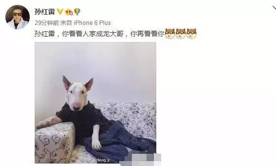 孙红雷还发了一只狗的照片,说跟成龙大哥比,自愧弗如: