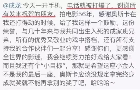 成龙在微博说电话被打爆了,收到很多朋友的祝福: