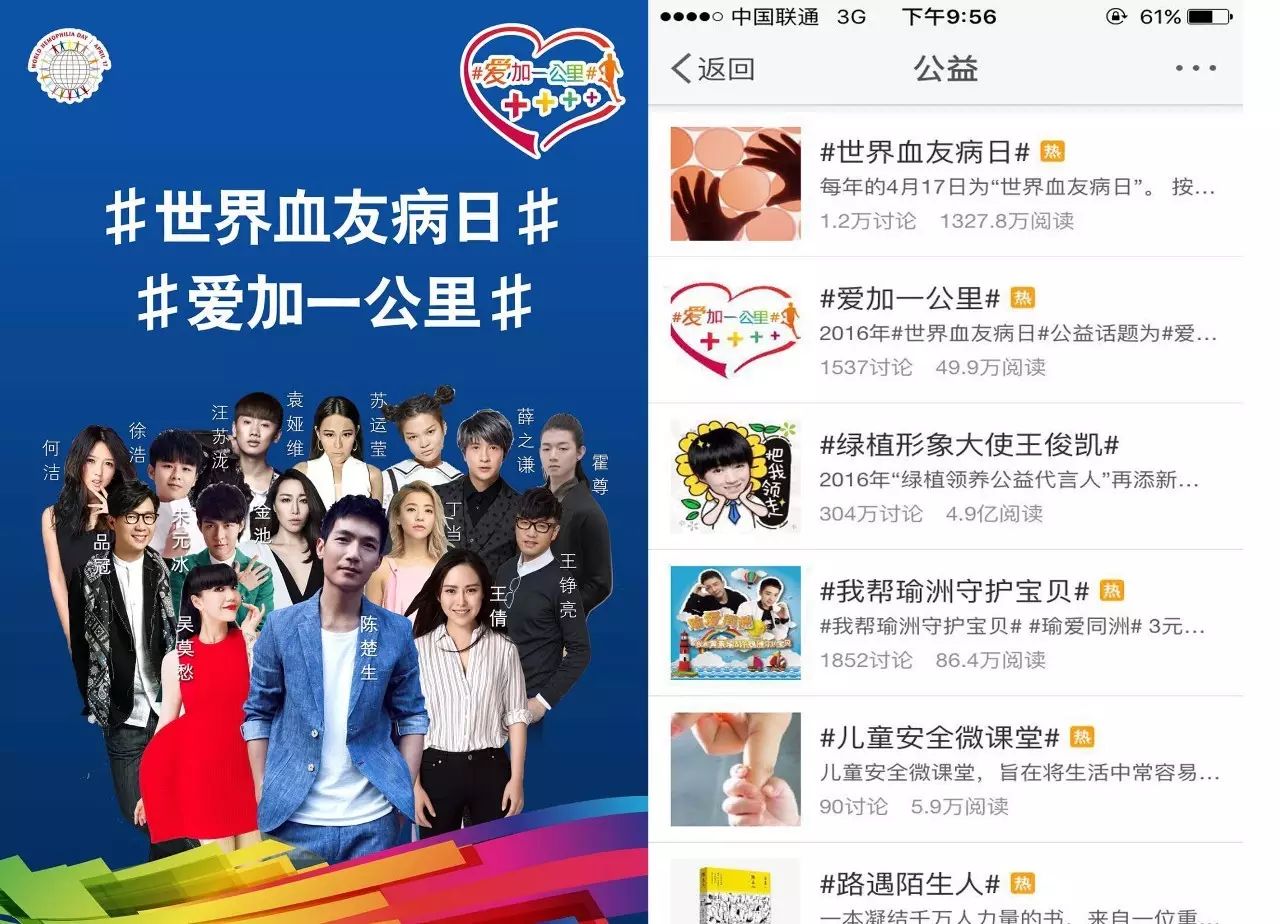 与“为爱而走”同时开展的2016年#世界血友病日#和#爱加一公里#互动传播活动,得到陈楚生、薛之谦、王铮亮、品冠、袁娅维、苏运莹、汪苏泷、金池、丁当、徐浩、霍尊、吴莫愁、何洁、朱元冰,以及BTV《生活面对面》主持人王倩等多位明星参与,微博话题获得近2,000万阅读量, 3万评论和转发。