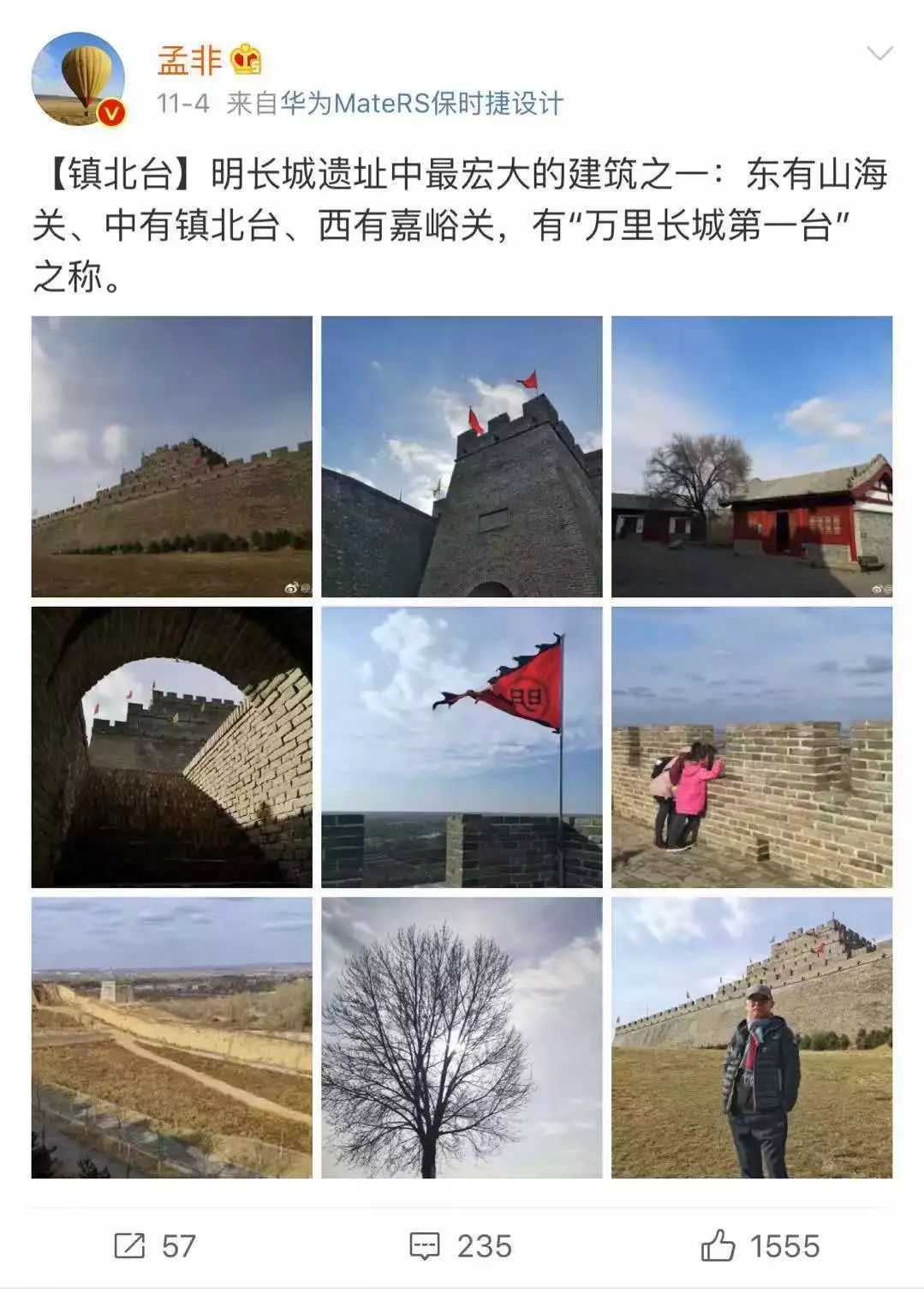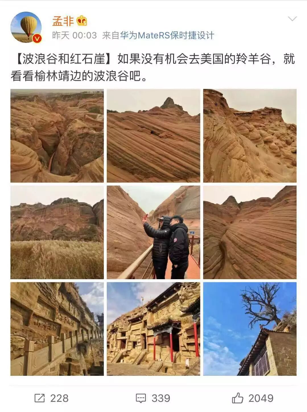 11月5日凌晨,著名主持人孟发微博称,“如果没有机会去美国的羚羊谷,就看看榆林靖边的波浪谷吧。并随文上传了系列,其到访龙洲丹霞地貌景区的照片,同时,据其微博可知,11月4日,孟非还游览了榆林镇北台,并称其为明长城遗址中最宏大的建筑之一。