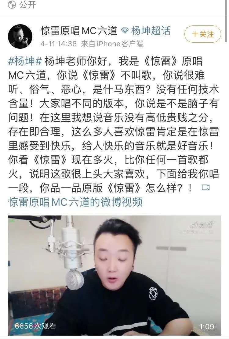 (视频:杨坤diss《惊雷》,称该歌曲完全算不上音乐!!)