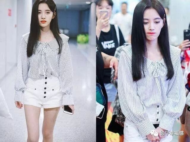 她的机场服装每一个造型都是美的,除了偶尔被吐槽身高,几乎没什么缺点,身高也是因为没什么可说,所以才从这下工夫,这一身上衣是条纹衬衫+排扣短裤,简单干净的感觉,加上简单的妆容就无可挑剔的美。