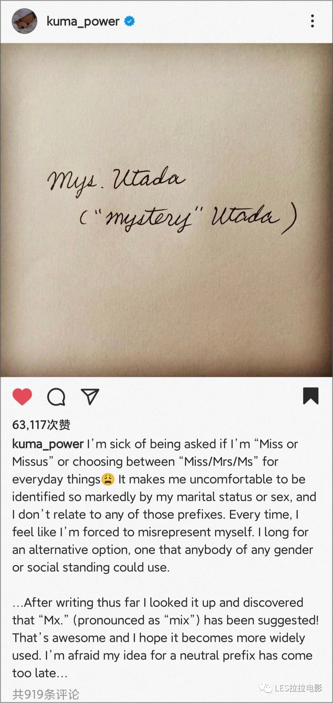 而且在此之前,宇多田光也在ins上表示,“我厌倦了人们问我是‘小姐还是夫人’(Miss or Missus),或是在日常事务中选择‘小姐/夫人/女人’(Miss/Mrs/Ms)。