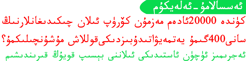 شۇنداق ئۆتۇنسەم تۇنۇگۇن 6000 ئادەم مەزمۇن كۆرۈپ 40 ئادەم ئاستىدىكى ئىلاننى چىكىپتۇ ، ئاستىدىكى ئىلان پۇتۇنلەي ھەقسىز ، تاماقتىن كىيىن دۇئا قىلغانغا ئوخشاش ئاستىدىكى ئىلاننى بىسىپ قويۇڭ ئىگەم ئەجرىڭىزنى بىرىدۇ