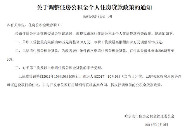 今天,哈尔滨住房公积金管理中心发布《关于调整住房公积金个人住房贷款政策的通知》,从2017年10月10号起,公积金贷款最高限额降低10万,购买三套房将不能使用公积金。