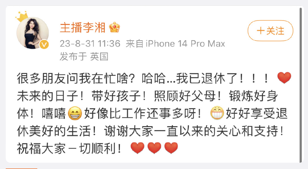 贵妇李湘,官宣退休 周冲的影像声色 内地女星 2023-08-31 21:24:55 349 创作不易,用心坚持,欢迎请BaGua喝几杯爱心咖啡!打赏并支持本文 打赏并删除本文 最怕你一生碌碌无为,还安慰自己平凡可贵。今天。47岁的李湘,官宣退休了。如此年轻,就已财富自由,令人羡慕得肠子都青了。注意这条微博的IP地址。“发布于英国。”是的,她人已经在英国了。于是一瞬间,相关词条,登上热搜。并长居第一的位置。有人开始接好运。相关微博,迅速转发到了3W以上。其实之前,有中介曾传过她在英国购买物业的事。她辟谣过:没买。但未购买房产,不代表生活不好。李湘的日子精彩无比。享用的,都是最精致华美的。居住的,都是最高端大气的。欣赏的,都是最美好、最有底蕴的风景。食用的,都是精致、美味、讲究至极的食物。这样的生活品质,非“豪奢”二字,不能形容。而能过上这种生活,财务上,一定要自由。财务自由,可不是指主动收入的可观。而是被动收入的惊人。也就是说,哪怕停下来,不再工作,也有巨额款项,源源不断地流入。李湘的被动收入,大概来自哪里呢?应该来自于她的大量投资。网上有人传,大学期间,她每个月都要买套房。并称当时她在三四环周边已经买了70多套房子。她爱买房的事,很多人都证实过。之前她前夫就说,她有一个爱好:买房,卖房。低价买入。高价抛出。赚了钱,低价买入更多。高价抛出更多。一来二往,积攒了巨额身家。何炅说,在限购之前,李湘就已经投资房产成瘾。不仅自己一人致富。也带着身边一帮人致富。因为投资意识在线,她的资产,据说已达到惊人身家。大家可能要问,我也想投资房产,但要有本金啊。她的第一桶金从哪里来?快本。1997年7月11 日,《快乐大本营》开播。 首批主持人是两个人:李湘、海波。何炅第二批才进入。所以,她堪称快本元老。当年的快本,说是中国第一娱乐综艺,一点都不为过。全国上下,男女老少,无人不知。李湘出众的长相,敏捷的反应,出色的口才,令人叹为观止。她很快就深入人心,人见人爱。名气大,能力强,节目火爆,收入肯定是惊人的。加上家庭背景雄厚。——母亲是汽车集团的董事,有自己的4S店。高收入➕家庭背景惊人,投资的底气就有了。2004年,李湘离开快本。成立自己的娱乐公司。何炅也说过,离开快本后,她去了北京发展。多次邀约何炅一起干。何炅留在了湖南台。李湘则在金融、股票、投资、创业、演艺等领域面面开花。她创立了自己的娱乐公司,投资了多部热播的影视剧,与湖南台也是深度合作,同时担任深圳台的副台长,还成为了360公司的副总裁。之前李湘就看准了,直播卖货是潮流。成了第一批直播带货的名人。超前的眼光,敏锐的商业嗅觉,雄厚的资本,令她资产指数级增长。如今,即使不工作,也日进斗金。悠哉游哉。余生逍遥。大家可能觉得,李湘是不可复制的。毕竟,商人家境,中国传媒大学的出身,快本第一女主持,房产投资大佬......这些标签,离我们都很远。但我们回到李湘起步之初,看看她的好强与倔强,或许有所启示。小学时,她是大队长;初中、高中时,是学生会主席。高中早已被保送天津大学。她拒绝了。因为,梦想的学校是北京广播学院。之后苦练基本功,以第一名的成绩,进入北广(如今的中国传媒大学)。加入快本时并不出众。只是作为备选。但她是有野心的。也有匹配野心的努力。7年里,“每天都要录节目,星期天也不能休息。”因上进,好强,业务能力扎实。一步步成了台柱子。当年何炅也青涩,跟着李湘,才有安全感。后来对投资开始感兴趣。不论金融、房地产还是股票,她都开始学习。所以,你可以说,李湘身上争议重重。但在实现目标上,她真的不可小觑。她是真的做到了这一点:想要什么,就去争取。想进入哪里,就努力触达。这说起来容易,做起来,难上加难。比如当下。我们很容易对自己说,算了,“躺平”吧,“摆烂”吧,反正也没什么出路。我理解这种感觉。但我仍然想说,还是更轴、更犟、更死磕一点吧。只要有机会,就死死把握住。有梦,创造机会也要追。因为人啊,未来十年、二十年,吃的全是前面十年、二十年努力的红利。你看,李湘47岁退休。她就必须从17岁开始,步步为营地努力。你如果也想47岁退休。你就得从此刻开始,一步步实现目标。周迅谈过一件事。1993年5月,她19岁,老师问她:“周迅,你能告诉我,你对于未来的打算吗?”她不知怎么回答。老师继续问:“现在的生活你满意吗?”她摇摇头。“不满意的话证明你还有救。你现在就想想,十年以后你会是什么样?”“我希望十年后的自己成为最好的女演员,出一张唱片!”说完以后,她大彻大悟。“当我意识到这是一个问题的时候,我发现我整个人都觉醒了。”为了成为“最好”的女演员,她从出道之初,就认真对待角色。她放弃了“差不多”心态,夺舍式表演,每出演一部,就被认可一部。她真的成为最好的女演员。2002年拿下影后,从此跻身一线。2003年,离1993年恰好十年整。如同冥冥天注定,她发布了她的个人专辑——《夏天》。命运就是这样,它会公平而缓慢地,验证你的努力。周迅说:“如果你能及时地问自己一句:‘十年后我会怎么样?’你会发现,你的人生就会在不知不觉中发生变化。时刻想着十年后的自己,你会朝着自己的梦想越走越近。”李湘也好,周迅也罢,虽然不可复制,但奋斗的逻辑是一样的。如果你希