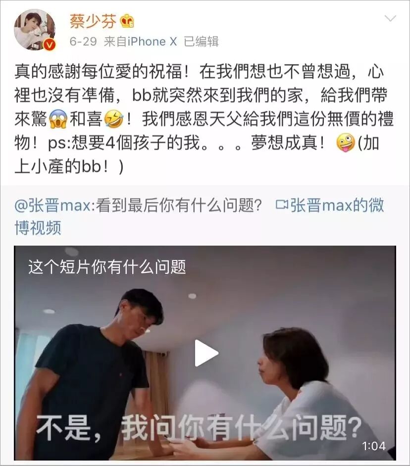 但是,前几天蔡少芬和张晋在微博自爆怀三胎的消息,实实在在给大家投喂了一大波甜糖。
