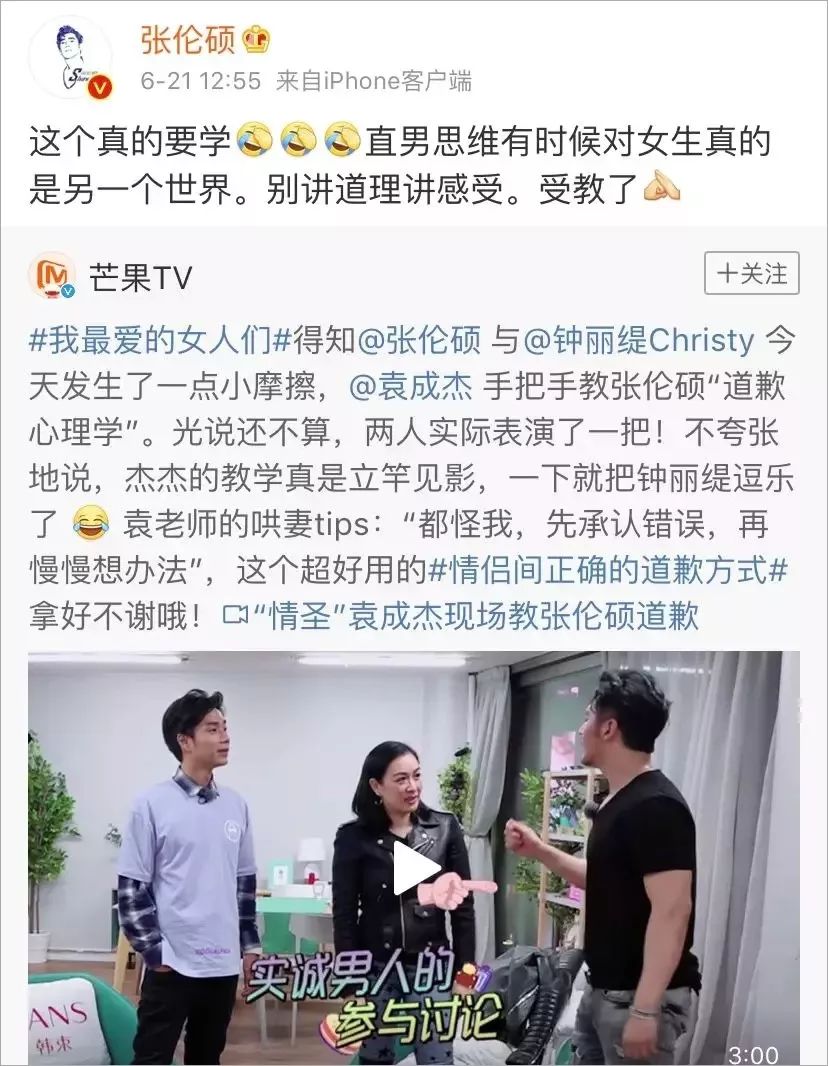 对于袁成杰所示范的道歉方式,张伦硕也发微博称:“这个真的要学,直男思维有时候对女生真的是另一个世界。”