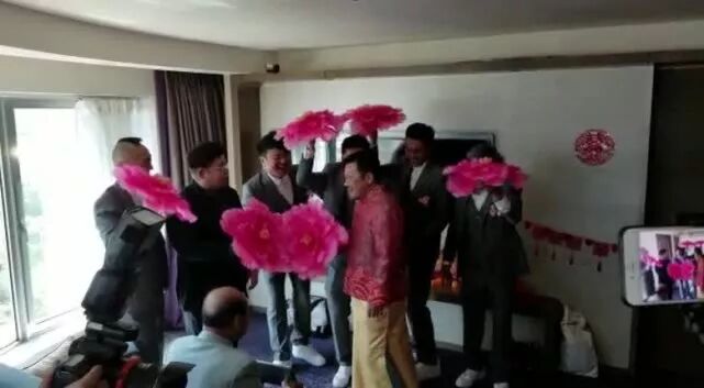10月6日早晨,韦家雄与一帮兄弟团杨明、戴耀明、李启杰、易智远接亲,他身穿一身中式大红色镶金礼服,手捧玫瑰花,看上去十分精神喜庆。