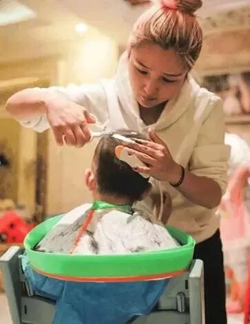 她像天底下最平凡的母亲一样,亲自给孩子剪头发。