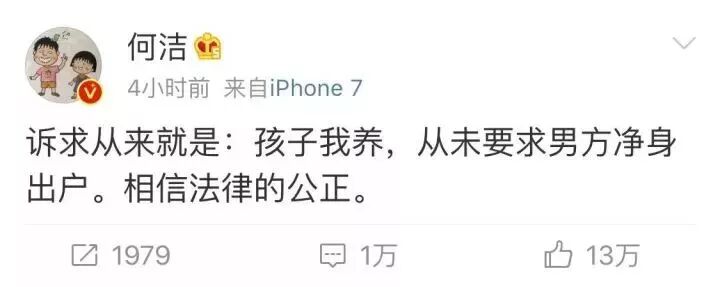 何洁更新了一条微博。她解释道,自己离婚的诉求,一直都是争取孩子的抚养权,没有要求过男方净身出户。