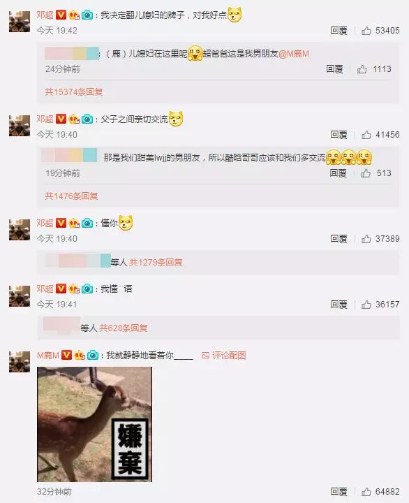 影片PO出不到1小时,瞬间登上了微博热搜排行榜前3名,许多粉丝纷纷在底下笑称,“最后不屑地走掉才是真正的想法”、“可怜我鹿晗有你这爸”,邓超也在底下留言注解,“我懂鹿语”、“父子之间亲切交流”,随后鹿晗也被钓出回应,“我就静静地看着你…。”还分享了一张写着“嫌弃”的梅花鹿图片,一来一往的逗趣互动让大家笑翻。
