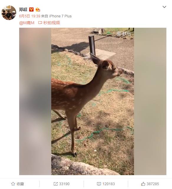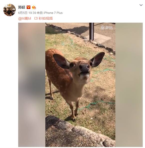 邓超在微博上分享了一段影片,并在发文中标记了鹿晗,只见画面中他镜头对着一只梅花鹿,一直追问:“小鹿说,你爸爸是不是这世界上最帅的人,是不是?告诉我!”该梅花鹿同时也在点头,接着他还是不断追问,“你爱你爸爸吗”、“你爸爸是邓超是不是”,一连串问题还没问完,梅花鹿就走开了。